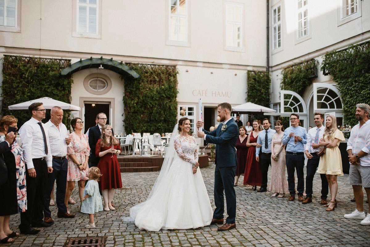 Celý den bylo krásné počasí, takže se většina svatby odehrála na nádvoří uprostřed HAMU, schovaném od ruchu okolních ulic.