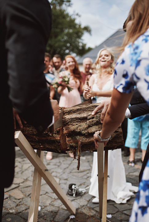 Z kaple vycházeli novomanželé jako poslední a venku na ně čekalo hned několik tradičních svatebních zvyků. Museli si projít špalír plný potlesku, přeštípnout okovy a přeříznout špalek.